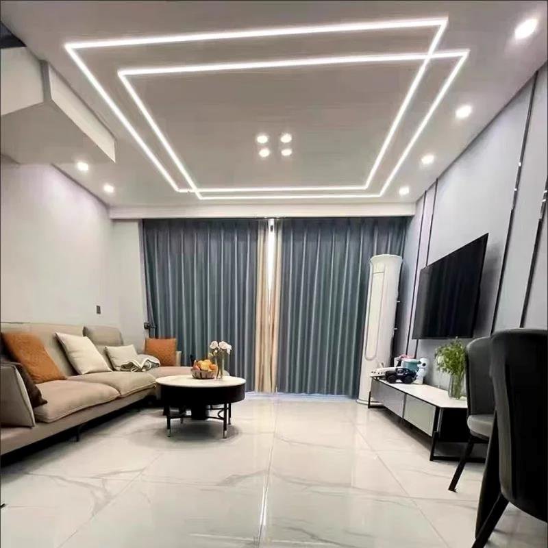 Elevate your space with a profile light ceiling design in the living room that will work in perfect harmony between form and function. A laired lighting plan includes mixing canned lights, stunning chandeliers, and sleek ceiling light cover designs to add depth and mood to your space. This way, you can modify the ambience depending on your mood — be it a quiet evening or a big group of friends. Installing false ceiling LED profile lights can provide sophistication as well as a soft, even light. The composite application of layer lighting and profile light lets your living space sparkle, bring warmth, luxury, the visual enjoyment.