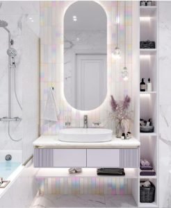 Try hanging some humorous, aquatic-themed artwork in a kids’ bathroom for a lively and long-lasting look. We’ve seen everything from “Surf’s Up” posters to goldfish prints with shark fins in the past, but this “Beach Barbie” shot tops the cake. To drive home the motif, designers utilised a bubble-gum pink area rug that may be switched out later. we hope these bathroom interior design ideas will give a trendy look to your bathroom.