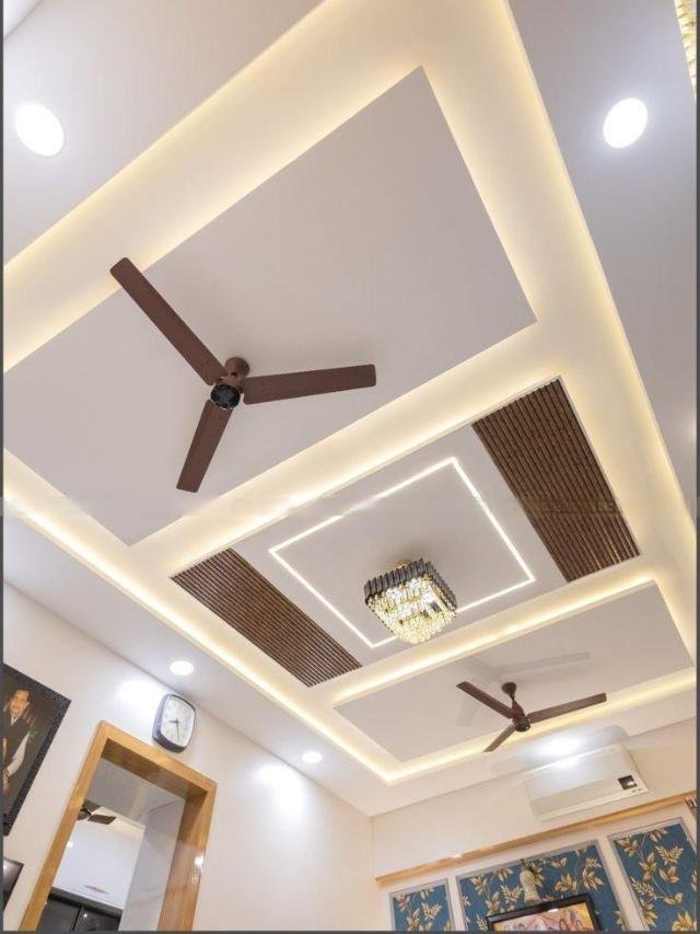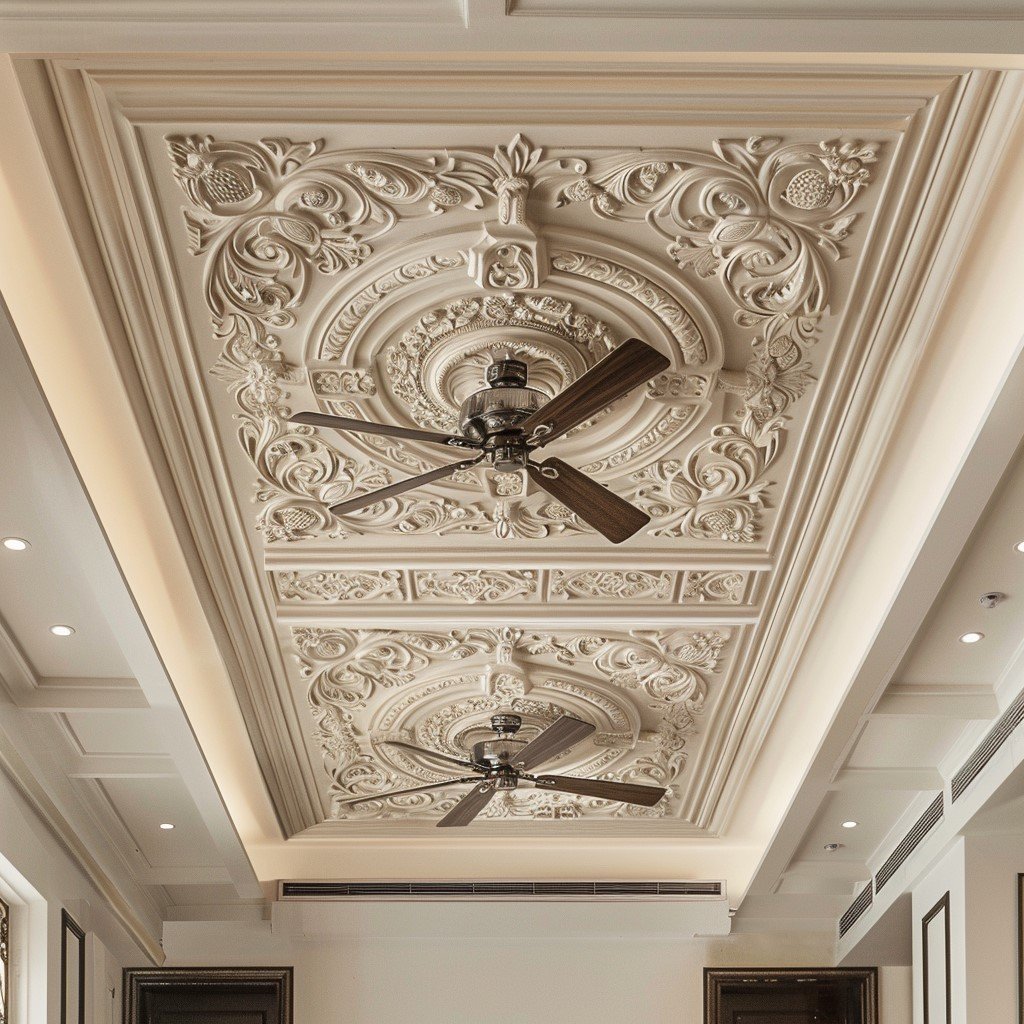 For people who adore the attraction of the beyond, incorporating Double Fan Ceiling Design Ideas with tricky antique carvings can convey a regal contact to your private home. Surrounding the fan furnishings with ornate details instantly transforms the ceiling right into a assertion piece, harking back to royal structure. This layout flawlessly enhances classical interiors, costly chandeliers, and rich furnishings. The fusion of artistry and functionality now not most effective enhances air circulation however also provides grandeur on your reception location. Such double fan ceiling ideas create a heat, timeless atmosphere that superbly celebrates tradition and sophistication.