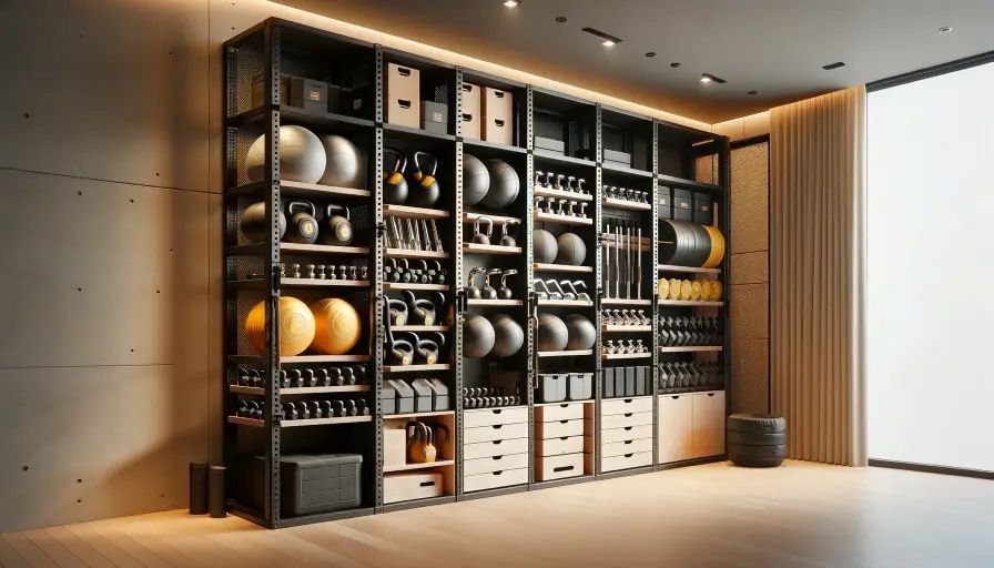 Yes, wall-mounted racks or hooks for weights, mats, and resistance bands can keep the space clutter-free while complementing your design aesthetic.