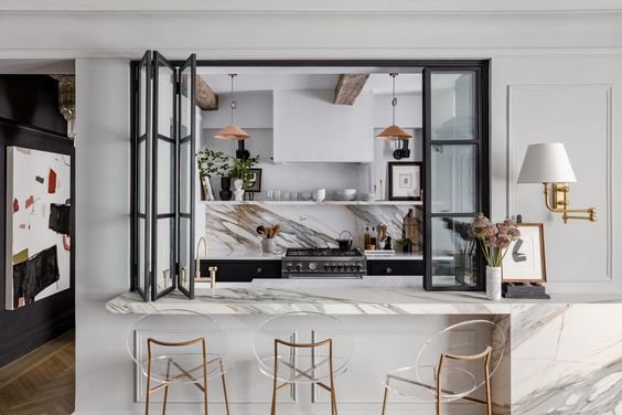Collapsible partition is one of the good kitchen partition designs which allow you to have or remove the partition whenever you like to. The door is easy to closes or opens with ease, no heavy lifting involved. Plus, when fully sealed, it doesn’t permit the sound and odor to reach your living room. And with them opened, you have the MOST space-efficient partitions –like wao!