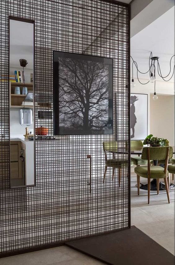 You can use a living room partition like this to make a foyer if there isn’t one. According to Vastu, there should be a foyer in every home. (And, of course, an entryway also leads up to a home.) For a lively entry to your home, pair this streamlined metal wall partition with hanging pots and a bold wall color.