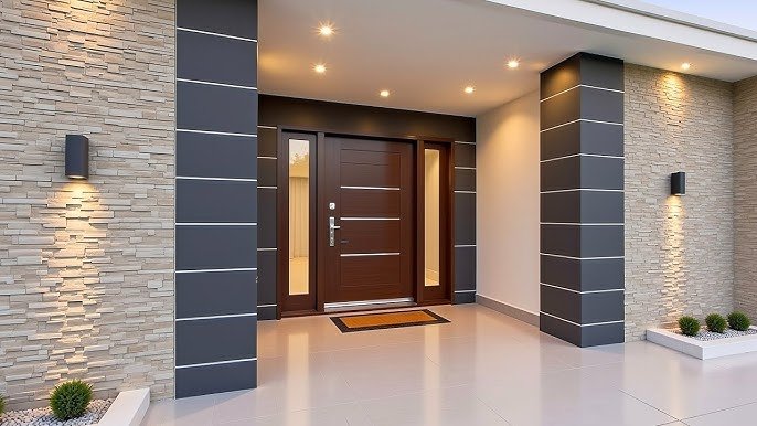 Design your front wall with a cutting-edge touch through incorporating tiles in diffused silver or elegant golden shades. These metal tones instantly raise your outdoors, creating a pricey and sophisticated attraction. As the herbal mild falls on the floor, these tiles replicate a smooth, dynamic glow that complements the general façade. This effect no longer only brightens your front but additionally adds intensity and dimension to your house’s layout. Choosing a modern-day front wall tiles layout with steel accents guarantees your outdoors stands out, presenting each style and visual effect while keeping a current, polished aesthetic.