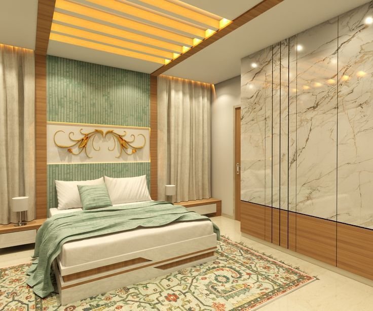 Sliding doors not only give a beautiful design impression but also save space. Such panels can be the main feature of an accent wall no matter if you choose appealing abstract designs, luxurious wood inlays, or clear frosted glass. They transform an ordinary storage cabinet into a gorgeous centerpiece, thus, revealing that the most functional parts of your bedroom can also be its highlights.