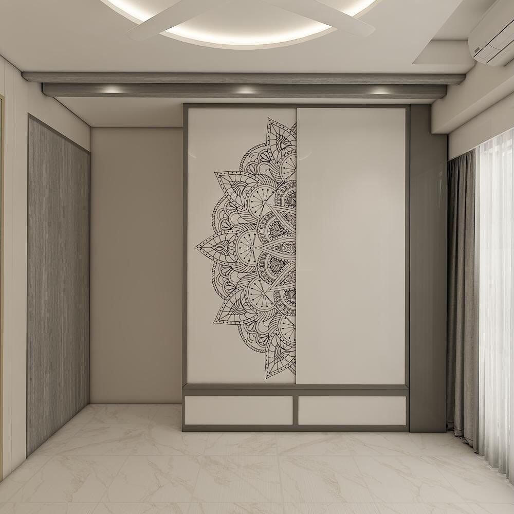 This is a style statement that you can undoubtedly adore! In this modern wardrobe door design concept, clean lines combine with geometric designs and make the style breathtaking. The taupe laminated doors are used with dark trimming to give a luxurious textile effect and one of the doors has a geometric overlay designed in lasers that ramp up the visuals in a second.